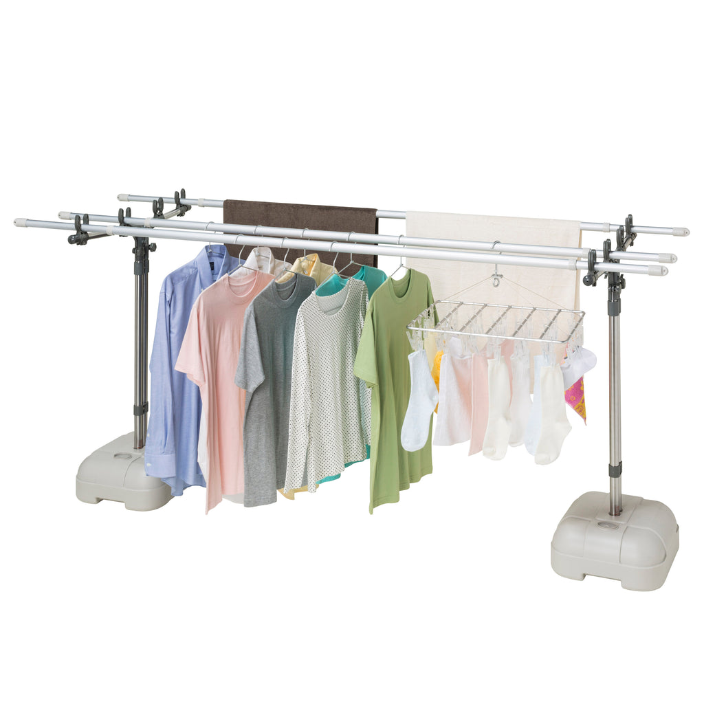 屋外やベランダでの洗濯物干しにぴったりな、安定性抜群の物干し台です。水や砂を入れて重さを調整できるブロー台付きで、風のある日でもしっかり安定。集合住宅のベランダや戸建ての庭先など、さまざまな屋外環境で活躍します。