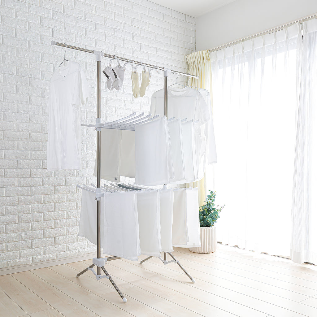 干し部3段で小物から長物まで効率良く干せる、室内用の大容量物干しスタンドです。